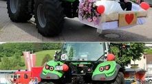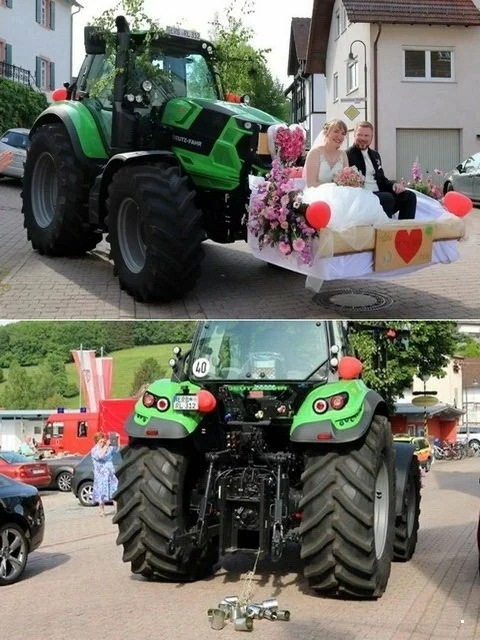Вы когда-нибудь видели свадебный трактор? А между тем они существуют. Парень, видимо, тракторист (или фермер) и очень гордится своей профессией. Поэтому на свою свадьбу он сделал специальное "ложе", которое прицепил вместо ковша спереди на трактор.