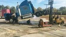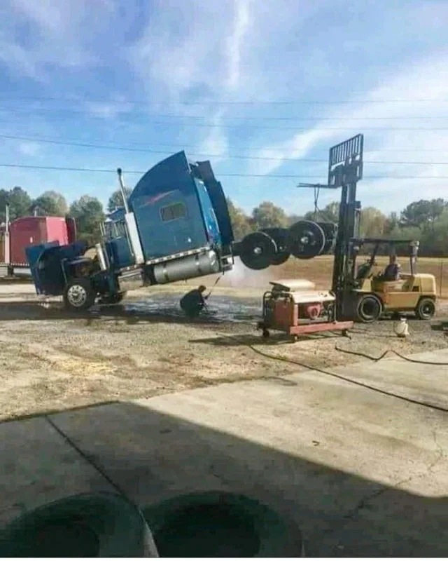 Такой вариант мойки днища американского тягача выглядит совершенно безумным. Заднюю часть подняли с помощью автопогрузчика, а водитель залез ПОД грузовик, чтобы промыть днище!