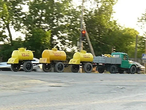 Такую картину можно было встретить во времена Советского Союза, но фотография сделана в наше время. Один грузовичок и сразу три прицепа-цистерны с квасом. Забавно выглядит, но разве законно передвигаться так по дорогам?