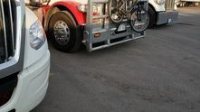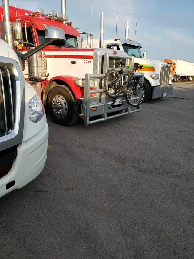 Необычный способ перевозки велосипеда. Этот дальнобойщик закрепил его на переднем "кенгурятнике". Прикольно смотрится и будет отпугивать других велосипедистов!