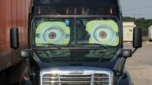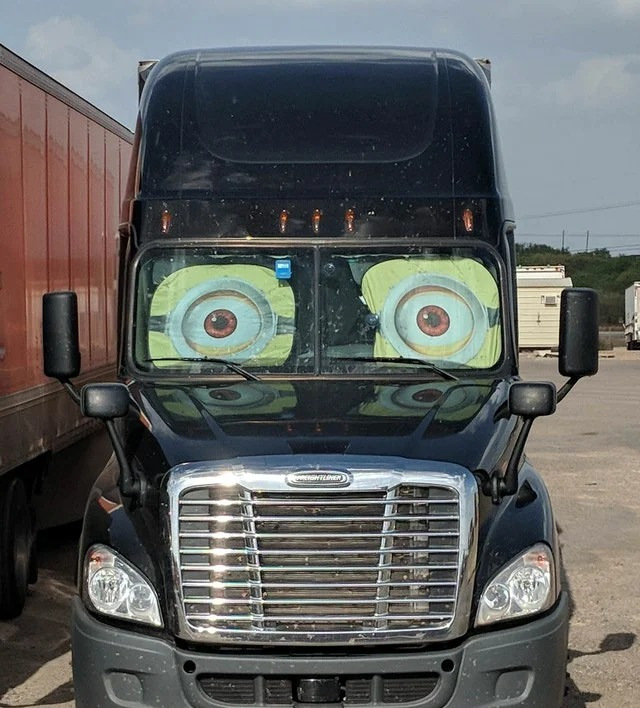 В одной из прошлых подборок мы уже публиковали фотографию "глазастого" Freightliner. Но она была довольно плохого качества. Этот снимок дает больше понимания о том, что же это такое. Оказывается, это шторки с принтом в виде глаз миньонов.