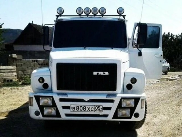 В последнее время мы наблюдаем за появлением огромного количества доработанных советских грузовиков. Этот ГАЗ-3307 взял всё лучшее от тонированных Lada Priora: белый цвет, непрозрачные окна, мощный передний бампер.