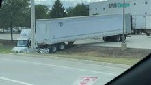 Водитель этого тягача с полуприцепом забыл заблокировать тормоза перед разгрузкой (или загрузкой) на большом складе. В итоге фура скатилась в ближайший ров. Повреждения, конечно, минимальные.