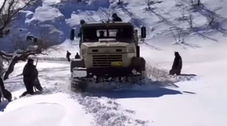 Посмотрите, как грузовик КрАЗ-260 пробирается сквозь сугробы в горах