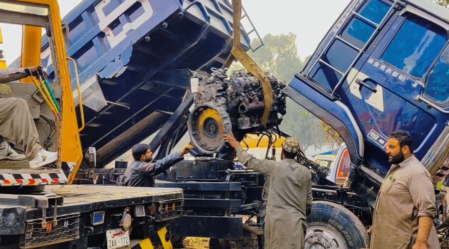 Посмотрите, как пакистанские дальнобойщики меняют двигатель на самосвале прямо на улице
